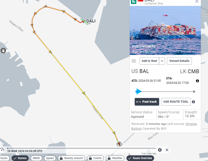Dali 달리 배 루트를 확인해보니 출항 후 금방 충돌 한 것으로 보인다.