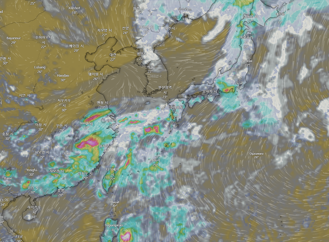 현재 장마전선은 중국 남부에서 일본 남쪽 해상까지 길게 형성되어 있습니다. 베트남과 중국 남부, 일본 오키나와 부근은 이 정체된 장마전선의 영향으로 강한 비구름에 휩싸여 있습니다. 아래를 보시면 장마 전선을 확인 할 수 있습니다. 조금만 올라오면 바로 대한민국입니다.