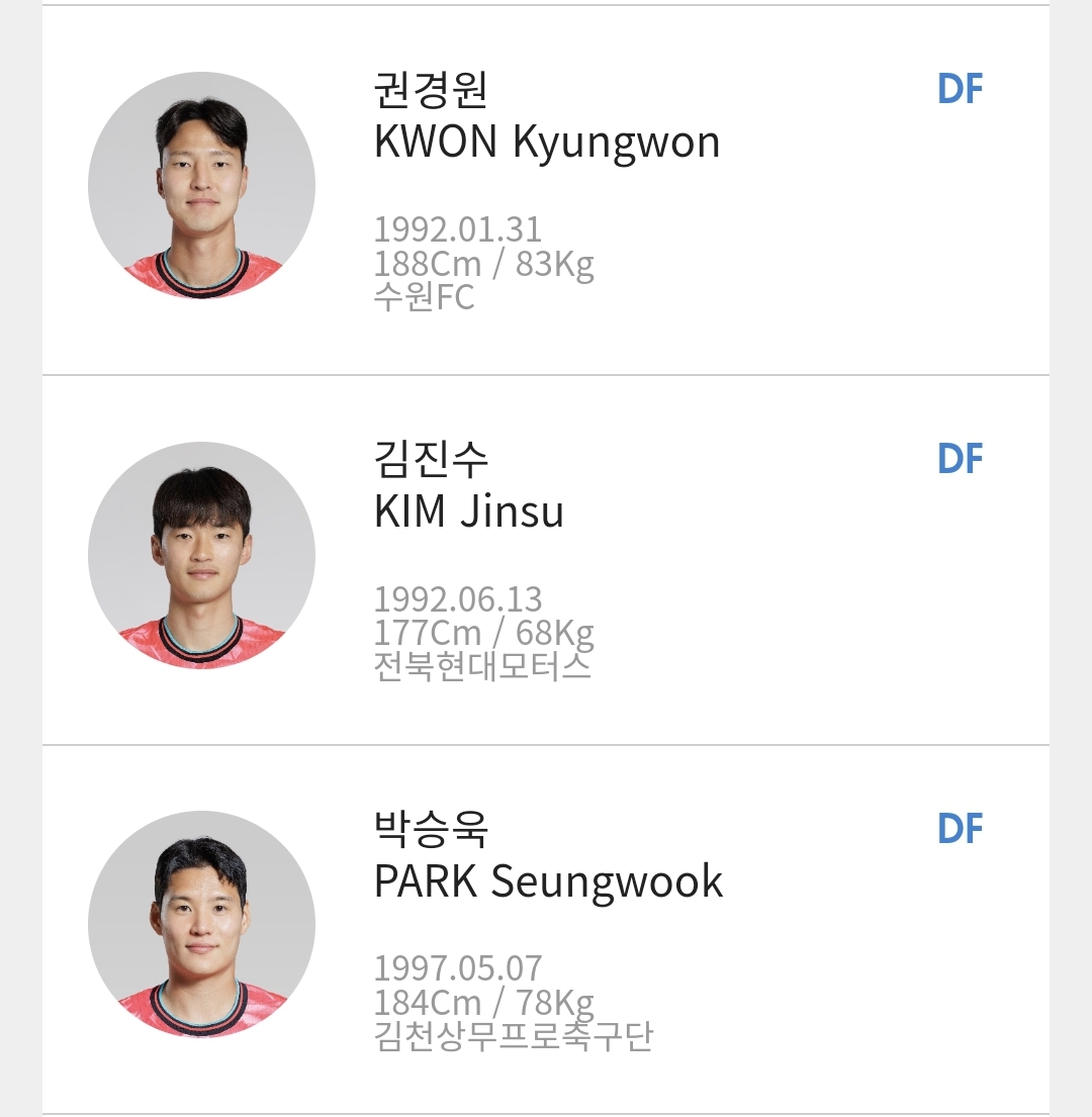 - DF: 권경원(수원), 김진수(전북현대), 박승욱(김천상무), 이명재(울산), 조유민(샤르자), 최준(FC서울), 하창래(나고야), 황재원(대구)