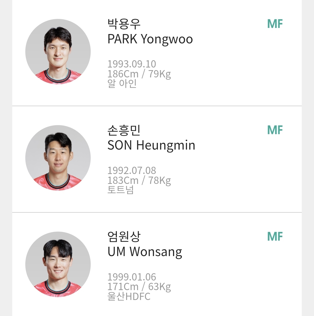 - MF: 손흥민(토트넘), 이강인(파리 생제르맹), 박용우(알아인), 엄원상(울산), 이재성(마인츠), 홍현석(KAA헨트), 황인범(FK 츠르베나 즈베즈다), 정우영(알사드), 황희찬(울버햄튼)