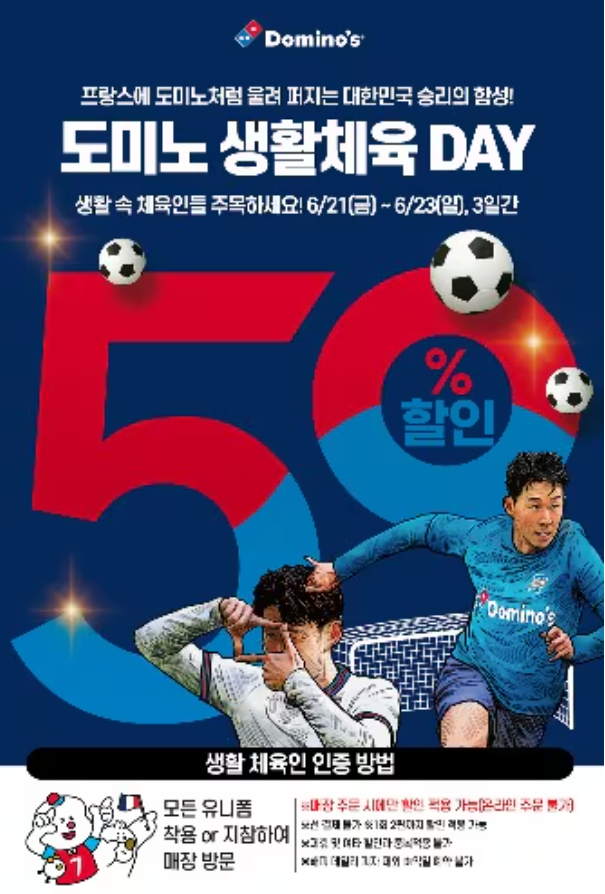 이번 도미노피자의 생활체육 이벤트는 6월 21일부터 23일까지 사흘 동안 진행됩니다. 행사 기간 동안 도미노피자 매장을 방문할 때 축구, 야구 등 어떤 운동 유니폼이든 착용하거나 지참하면 모든 피자(M, L 사이즈)를 반값에 구매할 수 있습니다. 이번 행사는 오프라인 매장에서만 적용되며, 1회 주문 시 최대 두 판까지 가능합니다. 운동을 사랑하는 분들에게는 절호의 기회입니다. 다양한 운동 유니폼을 준비해 두고, 가족과 친구들과 함께 도미노피자 매장을 방문해 즐거운 시간을 보내세요.
