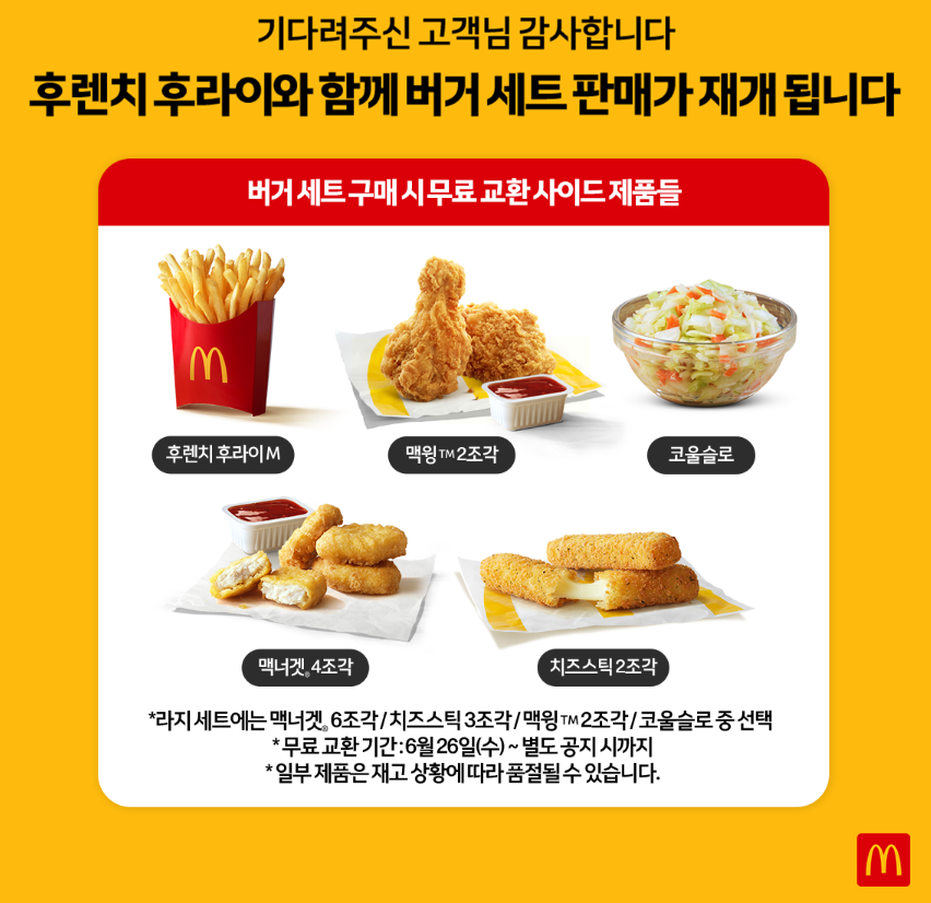 세트 메뉴 주문 시, 사이드 메뉴를 추가 비용 없이 변경할 수 있습니다. 이는 후렌치 후라이 수급이 완전히 정상화될 때까지 제공될 예정입니다. 맥도날드는 고객들의 기다림에 감사의 마음을 담아 이 같은 혜택을 준비했습니다. 세트 메뉴를 주문할 경우, 후렌치 후라이 대신 맥너겟, 골든 모짜렐라 치즈스틱, 코울슬로, 맥윙 등 4종의 사이드 메뉴로 변경할 수 있습니다.