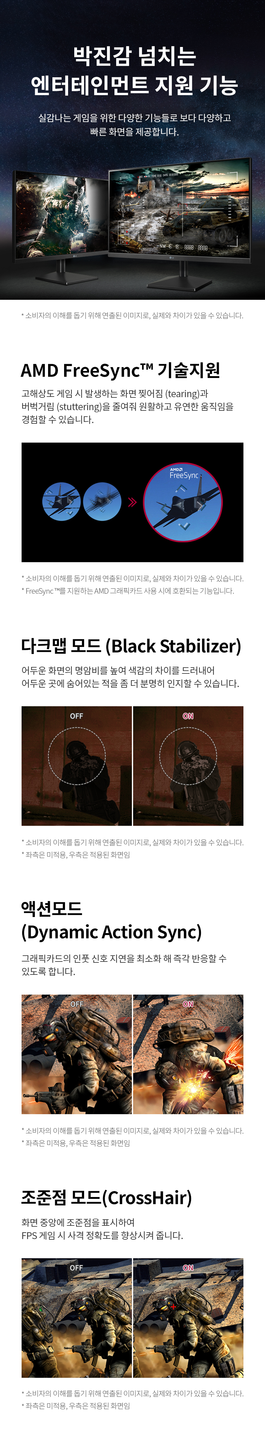 게임 사용자를 위해 AMD FreeSync, 다크맵 모드(Black Stabilizer), 액션모드(Dynamic Action Sync), 조준점 모드(CrossHair) 등의 게임모드를 지원합니다. 이 기능들은 게임 플레이를 더욱 향상시켜 줍니다.