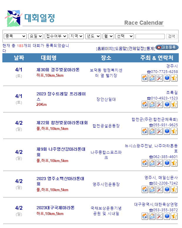 마라톤 대회 일정을 클릭하면 올해의 대회 일정이 업데이트되어 있습니다. 전국 곳곳의 마라톤 대회 정보를 쉽게 찾아볼 수 있어 초보자들에게 도움이 됩니다.