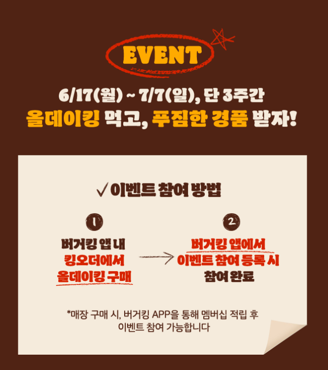 주의 사항으로는 1인당 최대 5개까지 구매 가능하며, 다른 할인 및 쿠폰과 중복 혜택이 불가능합니다. 또한, 딜리버리 주문 및 예약 주문은 불가하며, 일부 매장에서는 행사가 조기 종료될 수 있습니다.