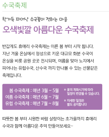 A. 제주도에서는 여름꽃 & 능소화축제, 휴애리 여름 수국축제, 휴애리 유럽 수국축제가 열립니다.