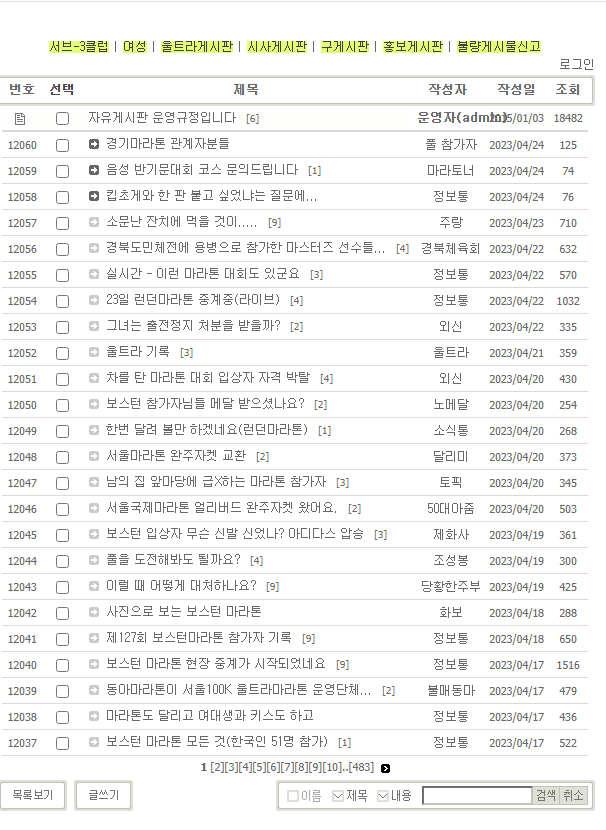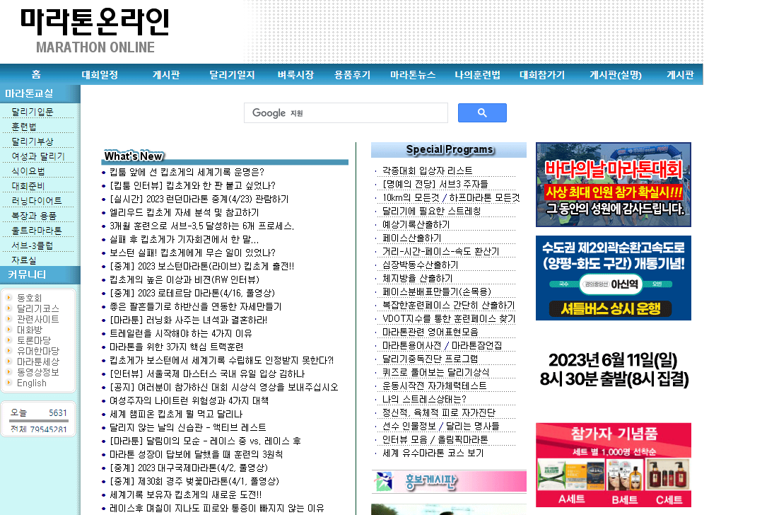 이 사이트는 오래된 것 같아 보이지만, 데이터는 최신 정보를 유지하고 있습니다. 상단 메뉴에서는 대회일정, 달리기 일지, 벼룩시장, 용품 후기, 마라톤 뉴스, 나의 훈련법, 대회 참가기, 게시판 등 다양한 메뉴를 확인할 수 있습니다.