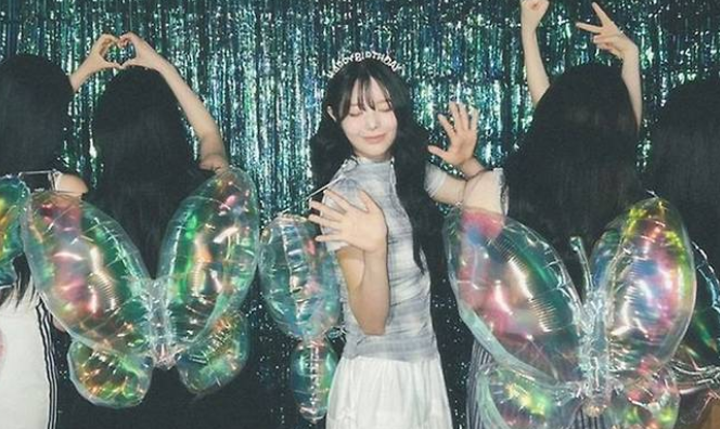 네 명의 새로운 멤버들은 나비 날개 모양 풍선을 들고 있어, 상큼하고 청순한 이미지를 예고하고 있습니다.