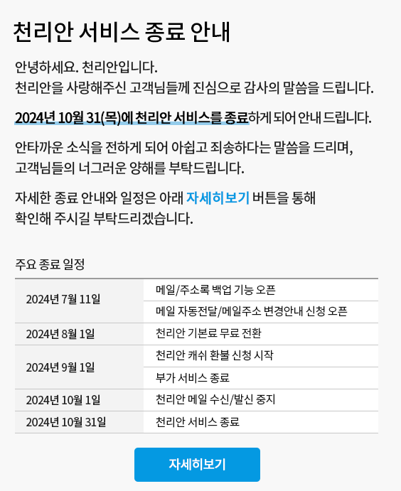 천리안 서비스 종료 후에는 다양한 메일 및 백업 서비스를 활용해 데이터의 안전을 보장하고, 새로운 서비스로의 전환을 원활히 진행하시기 바랍니다.