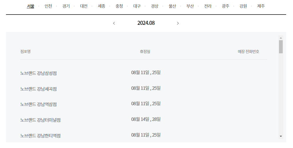 - 각 지점별로 다른 휴무일 확인