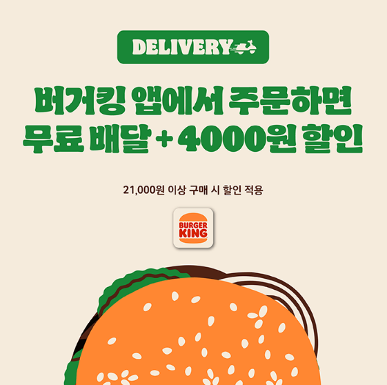 A. 21,000원 이상 구매 시 4,000원 할인이 적용되며, 이는 버거킹 앱이나 홈페이지에서만 가능합니다.