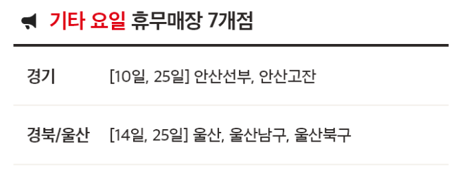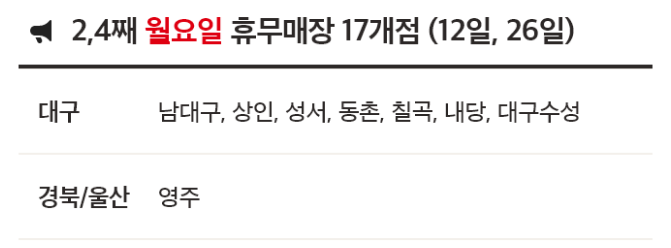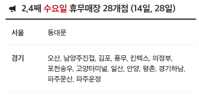 - 28개점: 둘째, 넷째 수요일 휴무