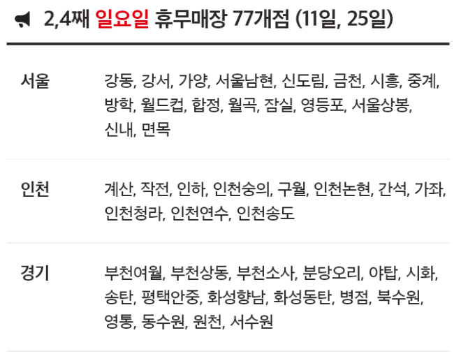 - 77개점: 둘째, 넷째 일요일 휴무