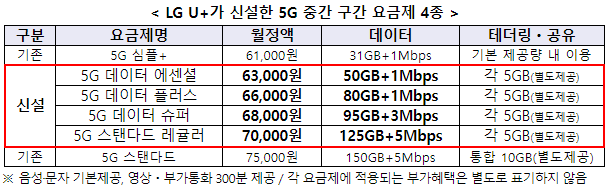 2022년 8월 출시된 31GB, 6.1만 원 요금제는 5G 이용자의 평균 사용량을 고려하여 만들어졌습니다. 그런데 31~150GB 구간에 해당하는 요금제가 없어 이용자의 선택권이 제한적이었어요. 이에 LG U+는 5G 이용자들의 선택권을 넓히기 위해 새로운 5G 중간 구간 요금제 4종을 선보였습니다. 이들 요금제는 50GB부터 125GB까지의 다양한 데이터 용량을 제공하며, 월정액은 63,000원부터 70,000원까지 입니다.