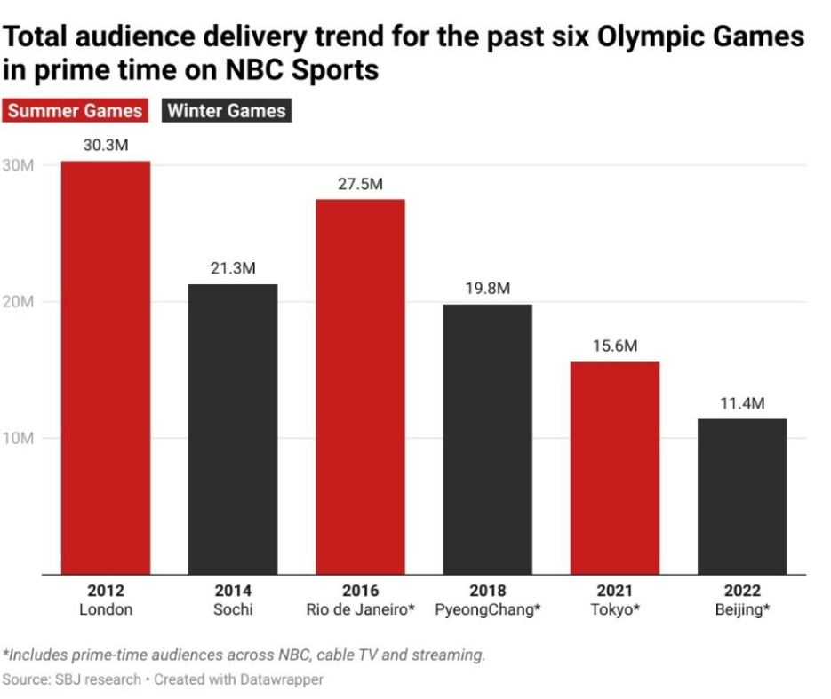 전 세계적으로도 올림픽에 대한 관심이 감소하고 있습니다. 2012년 런던 올림픽에서 최고점을 찍은 이후, 시청자 수는 빠르게 감소하고 있습니다. 올해 올림픽은 그 하락세가 더 가파를 것으로 예상됩니다. 특히 젊은 세대들은 누가 금메달을 따는지보다는 인기 스포츠 리그의 선수들에게 더 큰 관심을 보이고 있습니다. 예를 들어, 미국 농구 국가대표팀 경기는 여전히 많은 관심을 끌었지만, 이는 요키치와 미국 팀의 맞대결 때문이었습니다.