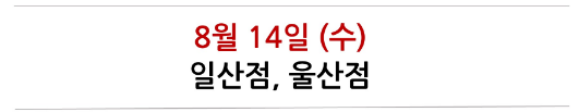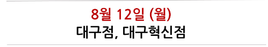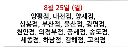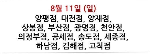 예를 들어, 서울 양평점과 양재점은 8월 11일과 25일에 휴무입니다. 경기 일산점은 8월 14일과 28일에 휴무합니다. 따라서 해당 지점의 방문을 계획하고 있다면, 이 날짜를 피해 일정을 조정해야 합니다.