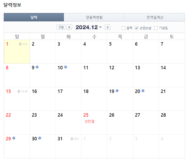 2024년 12월 이사하기 좋은 날 | 손 없는 날 | 날짜 달력