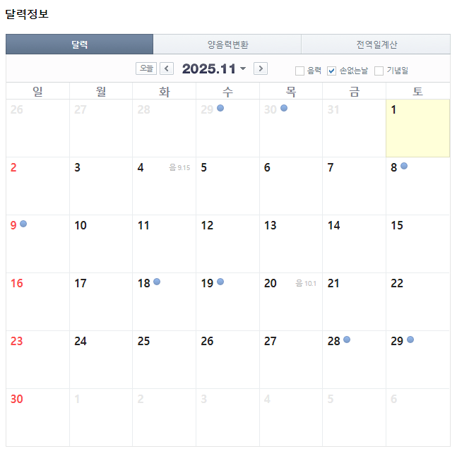 2025년 11월 이사하기 좋은 날 | 손 없는 날 | 달력 날짜