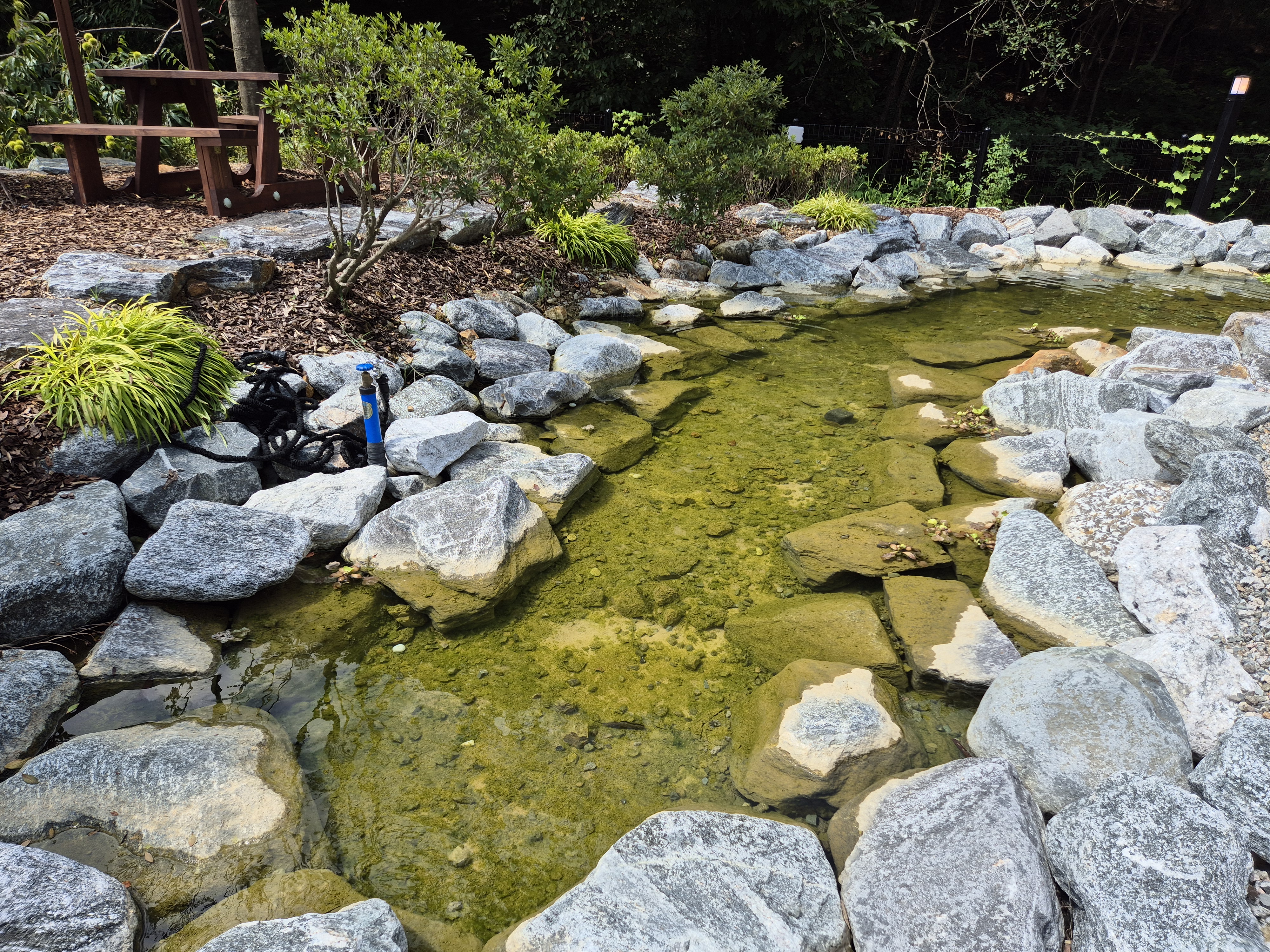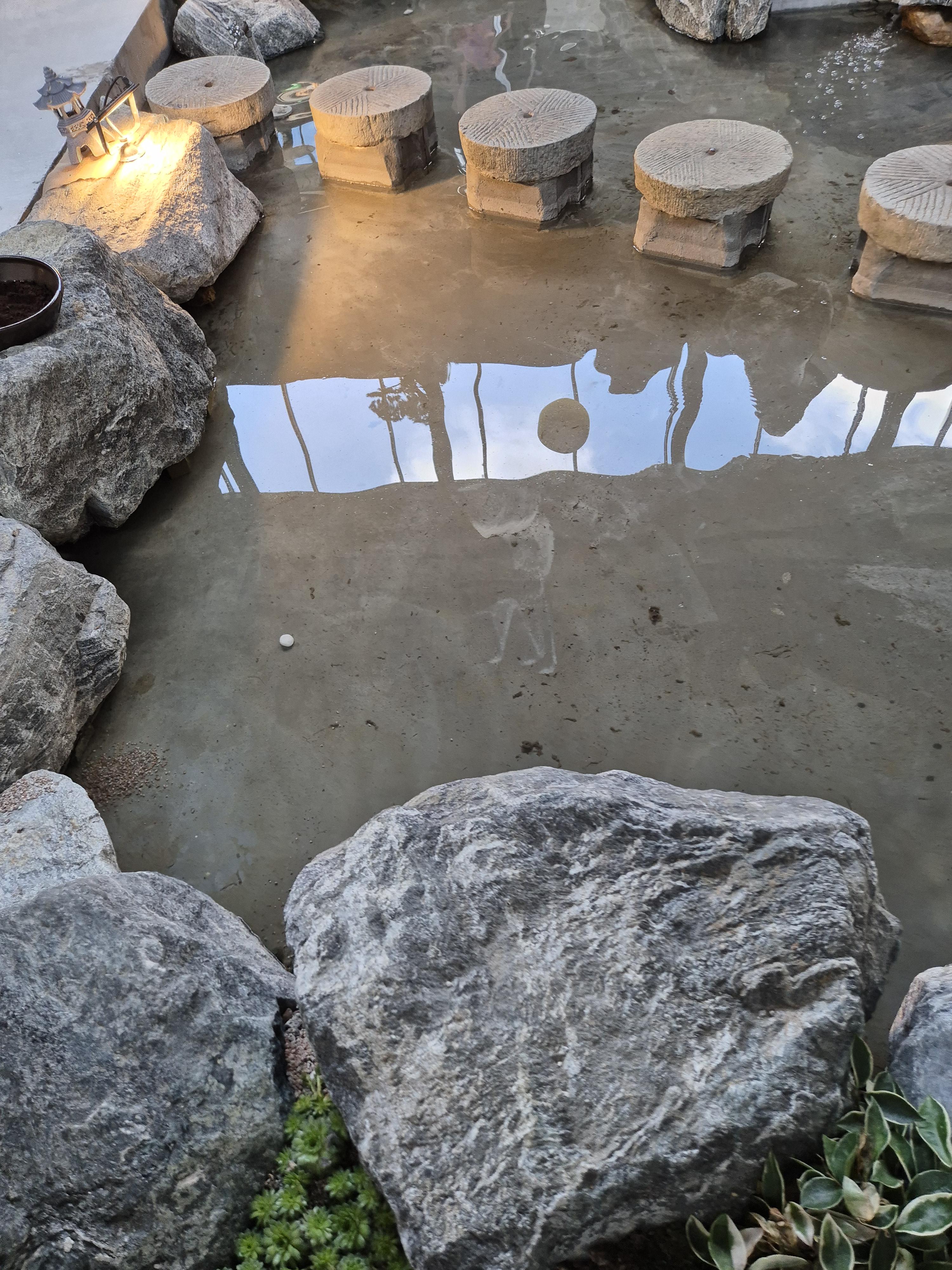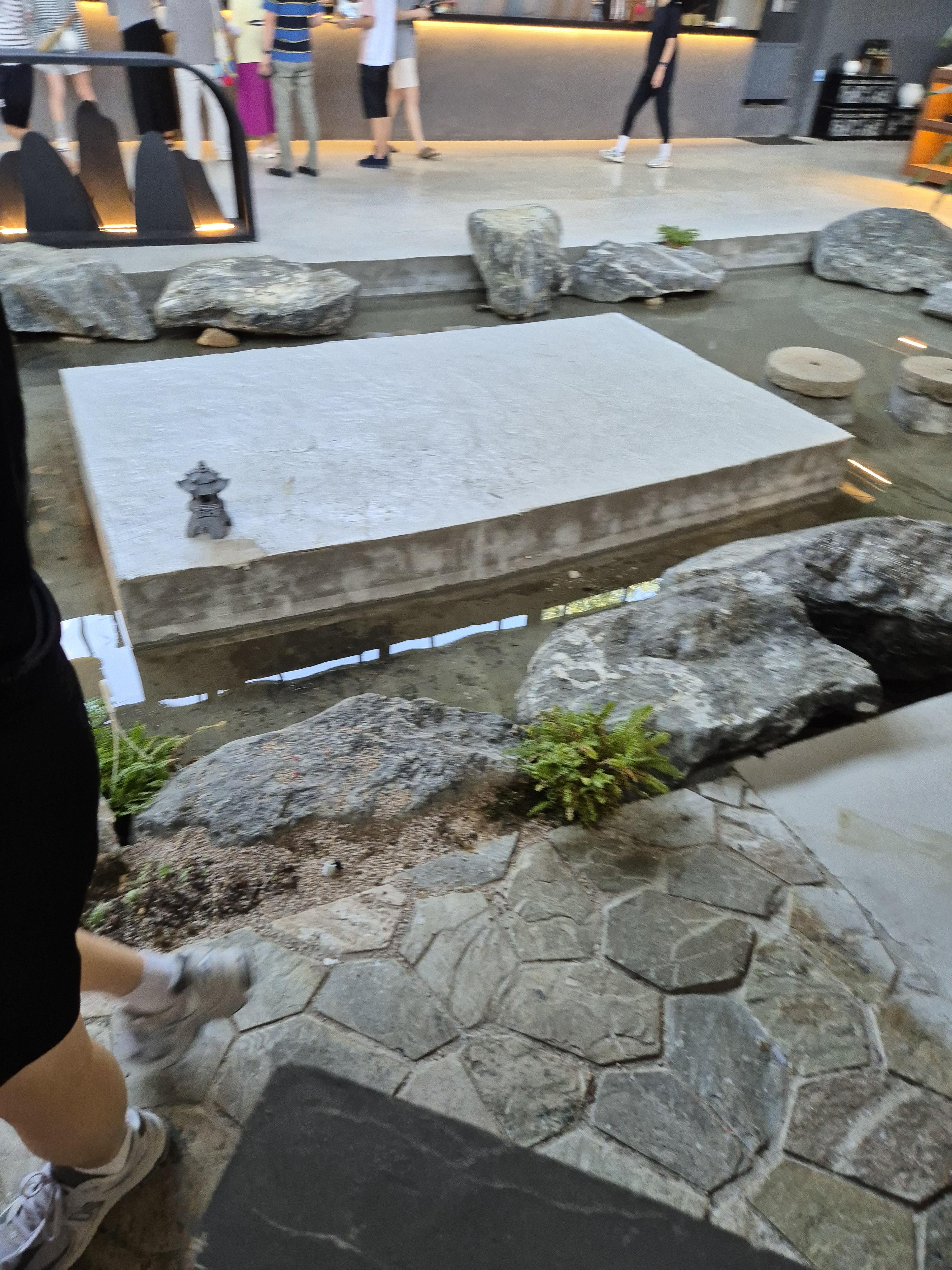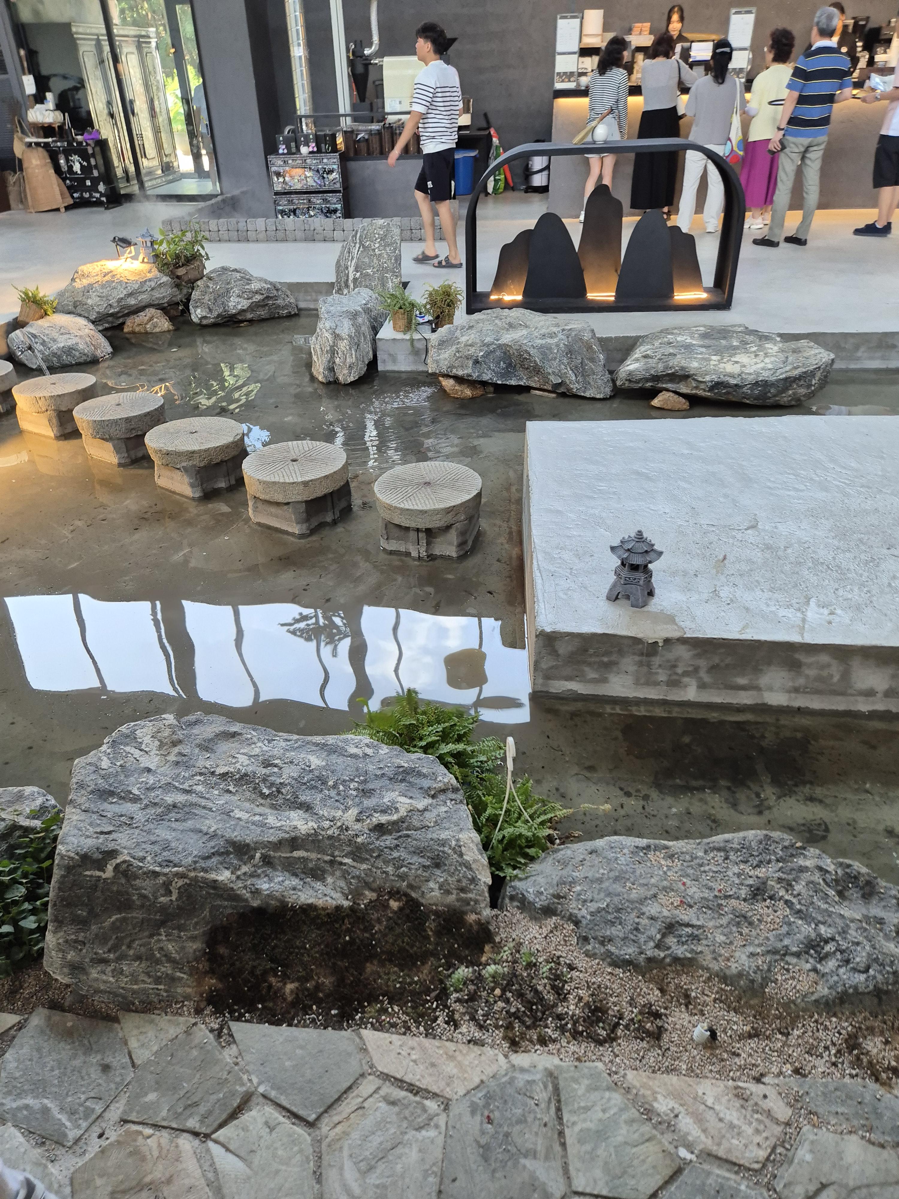 작은 연못도 실내에 있습니다. 징검다리도 있어서 건널 수 있습니다.