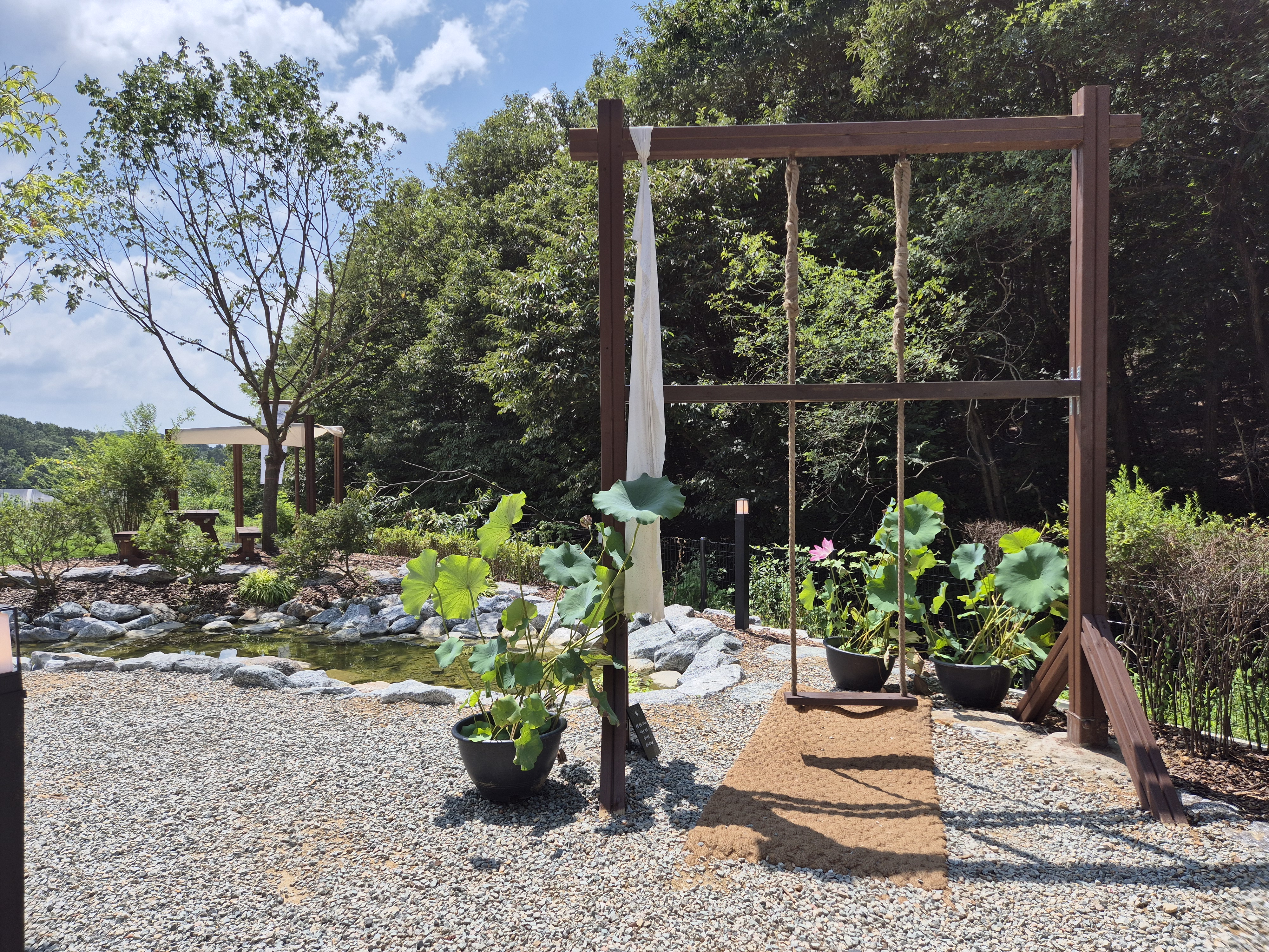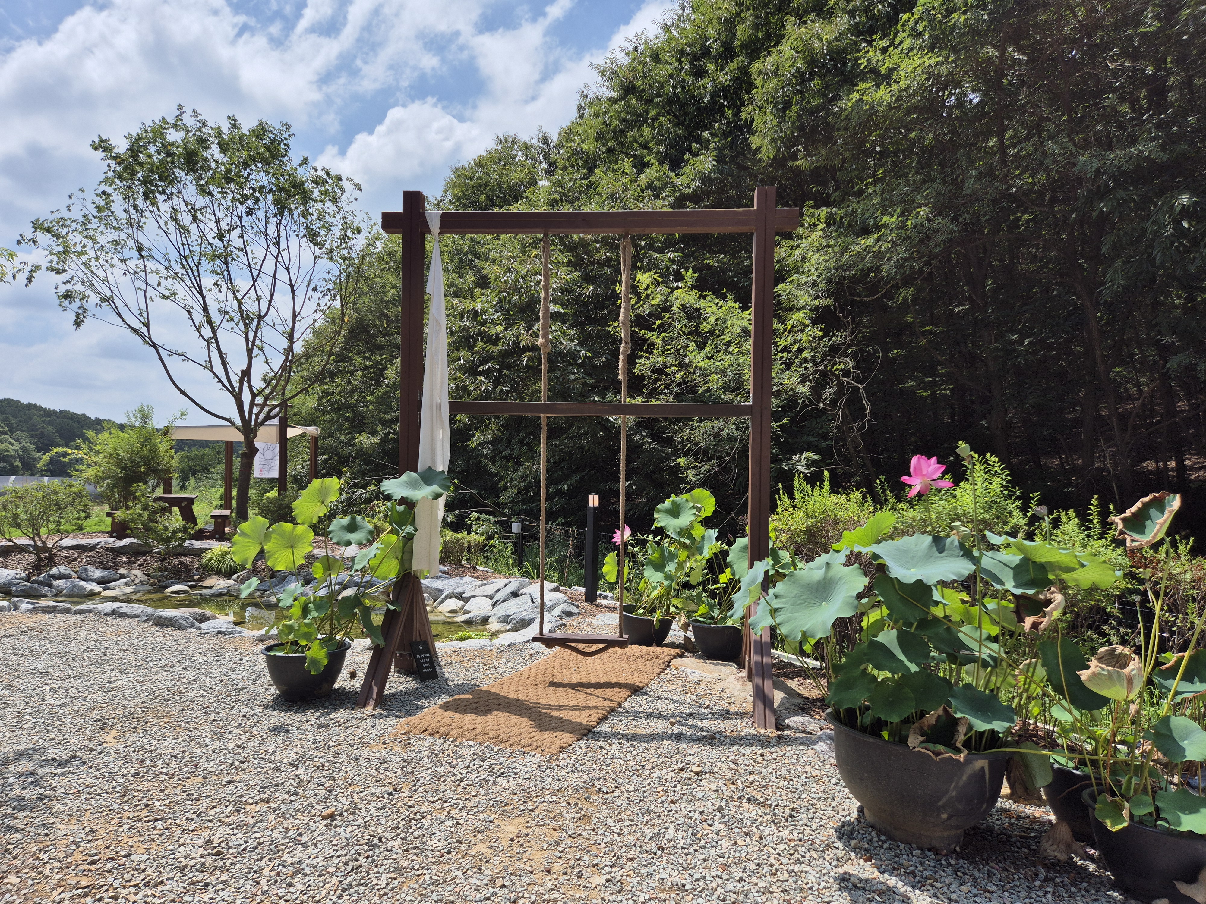 카페 주변을 돌아보니 작은 연못이 있으고 그 옆에 옛날 그네가 딱! 설치되어 있습니다.