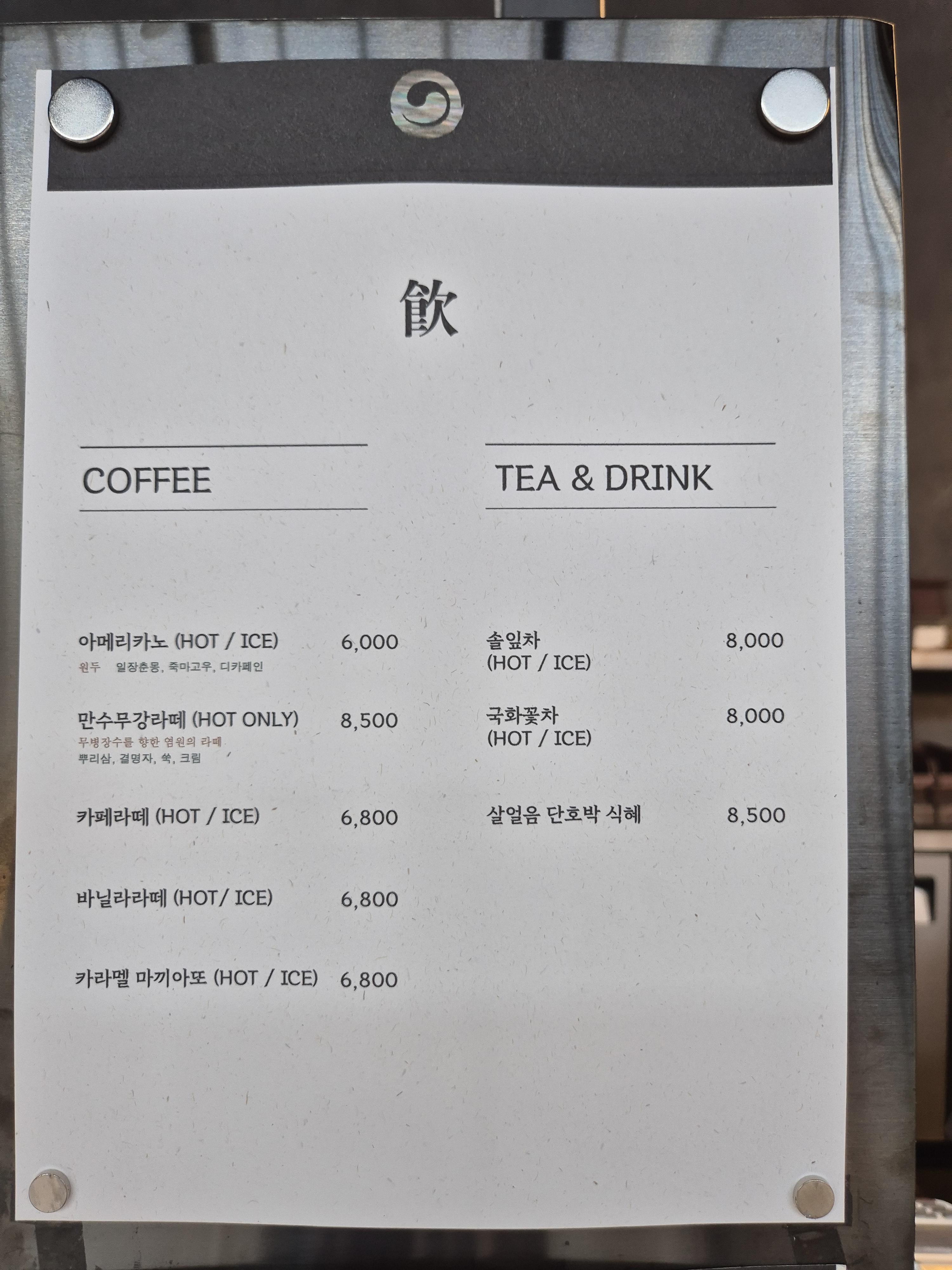 메뉴는 아래와 같습니다. 커피 4종류와 3가지 티, 그리고 식사는 3종류. 식사는 가격이 생각보다 저렴합니다.