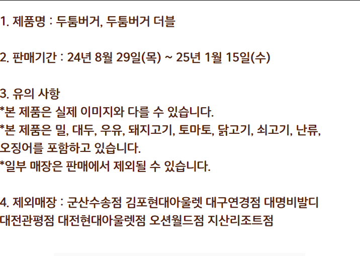 | 두툼버거 | 2024년 8월 29일 ~ 2025년 1월 15일 | 알레르기 유발 가능성, 특정 매장 제외 |