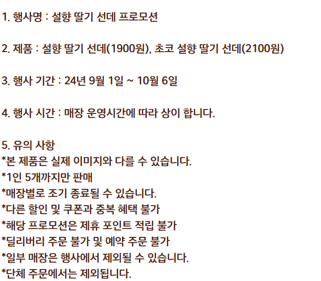 | 설향 딸기 선데 | 2024년 9월 1일 ~ 10월 6일 | 1인당 5개 제한, 특정 매장 제외 |