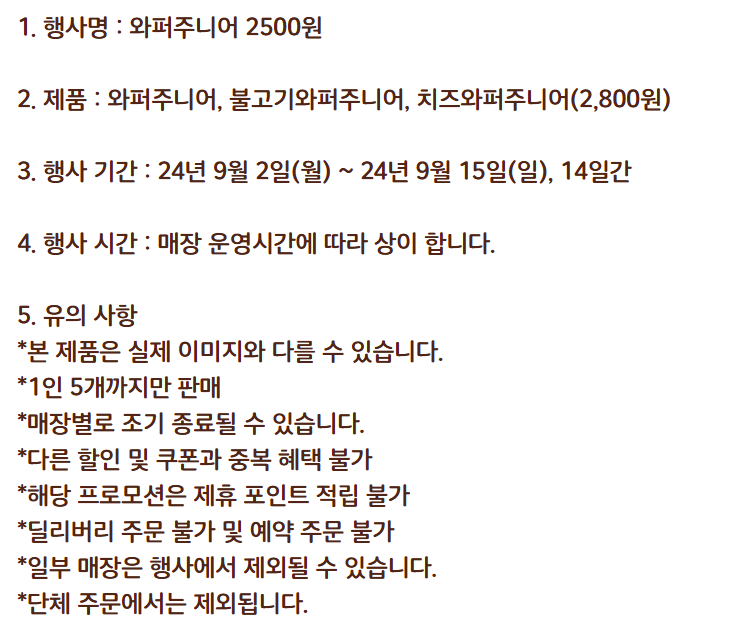 | 와퍼주니어 프로모션 | 2024년 9월 2일 ~ 9월 15일 | 1인당 5개 제한, 특정 매장 제외 |