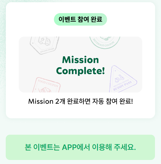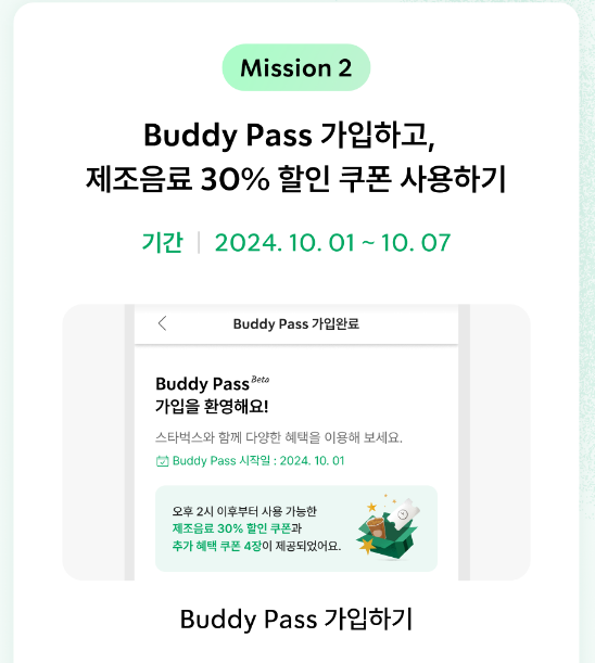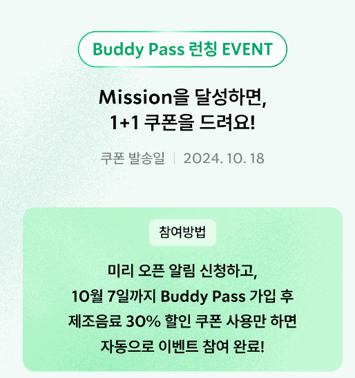 스타벅스는 Buddy Pass 론칭을 기념하여 9월 24일부터 일주일간 사전 알림 이벤트를 진행한다. 사전 알림을 신청한 고객이 론칭 후 구독 서비스에 가입하고 제조 음료 30% 할인 쿠폰을 이용하면 제조 음료 1+1 쿠폰을 증정한다. 이는 새로운 구독 서비스를 체험하고자 하는 고객들에게 추가적인 혜택을 제공하여 참여를 독려하는 취지이다.