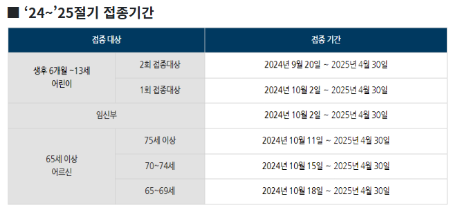 | 접종 기간은 언제까지인가요? | 2024년 9월 20일 ~ 2025년 4월 30일 | 기간 내 접종 권장 |