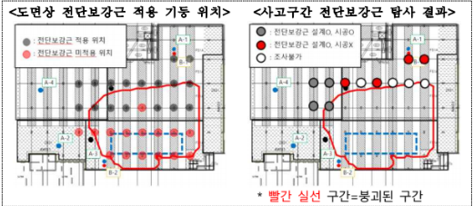 조사 결과에 따르면, 구조상 32개의 전단보강근을 설치해야 하였지만, 실제로는 17개만 설치되었으며 이러한 설계 부실이 원인이었습니다. 설계상으로도 전단보강근이 부족했지만, 실제 시공 과정에서도 문제가 있었습니다. 17개 중 절반에 해당하는 전단보강근이 실제로는 설치되지 않았으며, 이는 매우 심각한 시공 부실입니다.