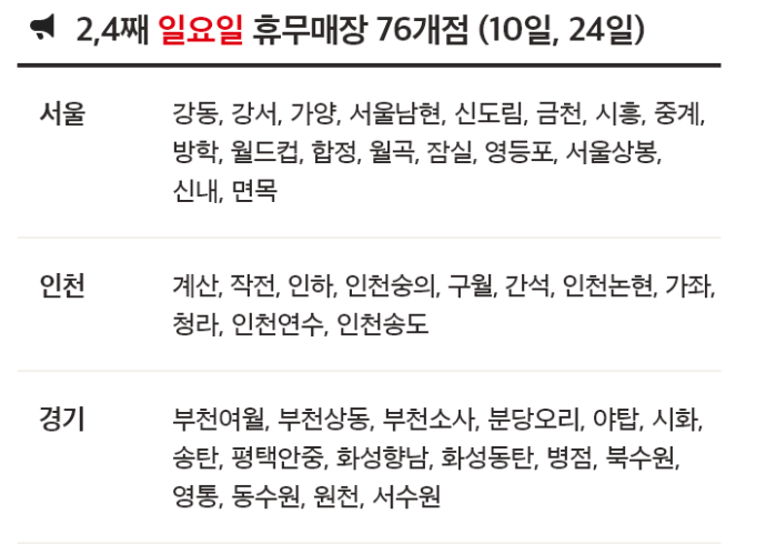 A. 일반적으로 휴무일에는 오프라인 매장에서 할인 행사가 진행되지 않습니다. 그러나 휴무일 전후로 다양한 할인 이벤트가 진행되니, 공식 채널을 통해 정보를 확인하시기 바랍니다. 이를 통해 알뜰한 쇼핑을 즐기실 수 있습니다.