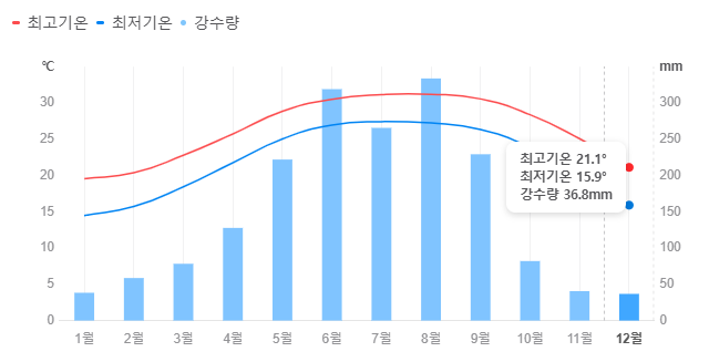 | 평균 기온 | 15°C ~ 20°C | 낮과 밤 기온 차이 있음 |