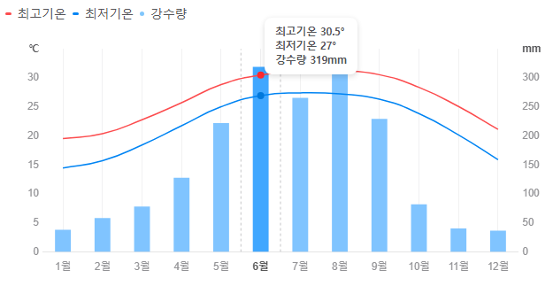 이러한 날씨 조건 때문에 여행 시에는 가벼운 옷차림과 함께 우산이나 우비를 항상 휴대하는 것이 좋습니다. 일조량도 강해 자외선 지수가 높으므로 자외선 차단제와 선글라스도 필수품입니다. 실내외 온도 차이로 인해 건강에 무리가 갈 수 있으니 주의하시기 바랍니다.