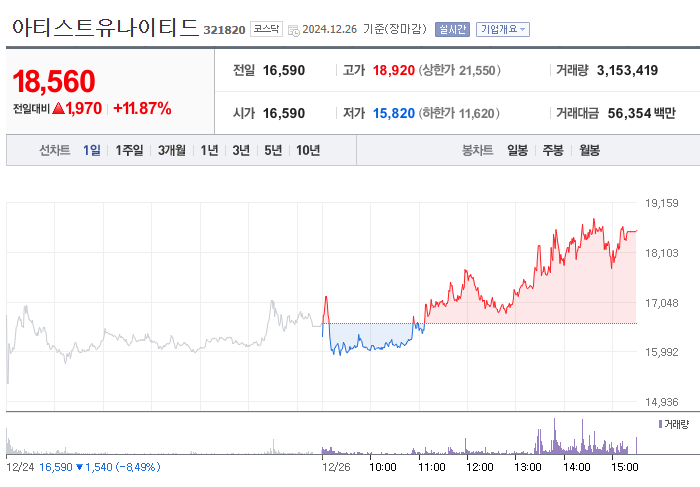 아티스트 유나이티드의 주가는 '오징어게임2' 공개를 앞두고 26일 기준으로 전날 대비 11.87% 상승하며 18,560원을 기록했습니다. 이러한 주가 상승은 아티스트 컴퍼니와의 합병 소식이 투자자들에게 긍정적으로 작용한 결과로 풀이됩니다. 앞으로 두 회사의 합병을 통해 글로벌 시장에서의 입지를 더욱 강화할 것으로 기대됩니다.