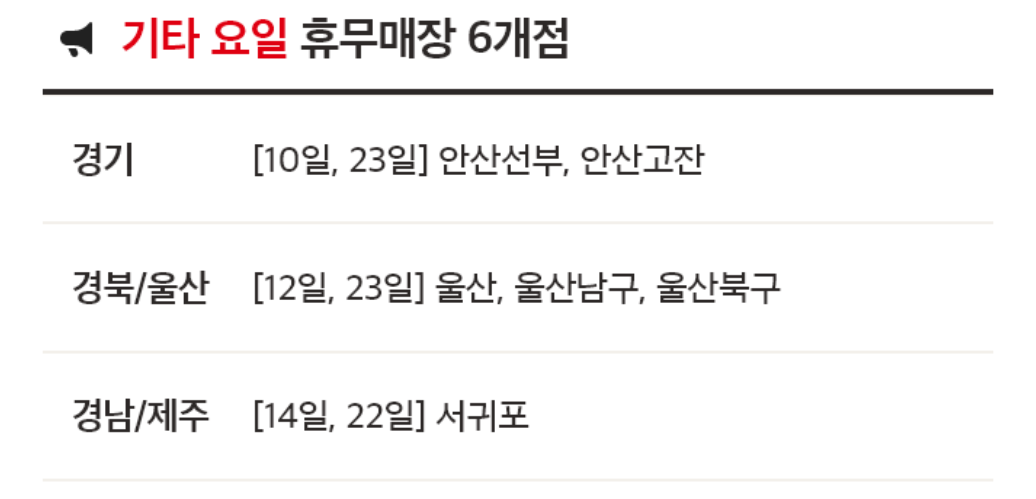 | 2,4째 월요일 휴무매장 10일, 24일 | 18개점 | 서부산 부산반여 논산 대구수성 등 |
