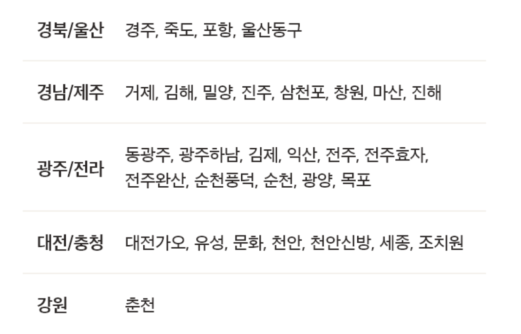 2,4째 월요일 휴무매장 10일, 24일 | 18개점 | 서부산 부산반여 논산 대구수성 등 |
