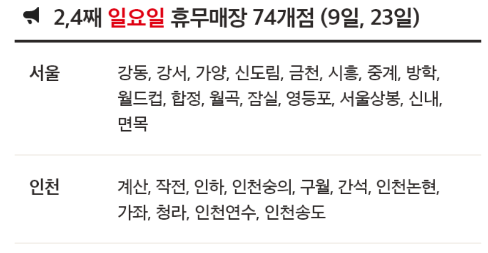 | 2,4째 일요일 휴무매장 9일, 23일 | 74개 | 강동 강서 가양 신도림 금천 등 |