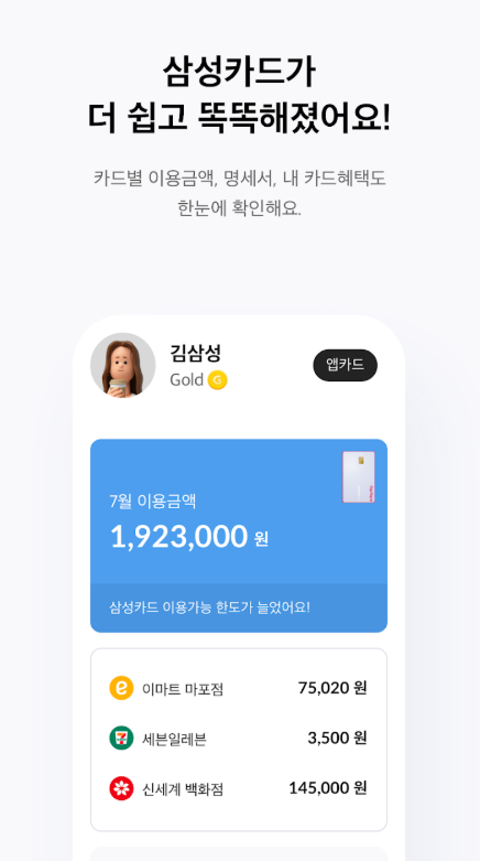 삼성카드 앱을 실행하고, 홈 화면에서 앱카드 메뉴를 선택합니다. 앱카드를 선택한 후 결제에 필요한 인증 절차를 진행합니다.