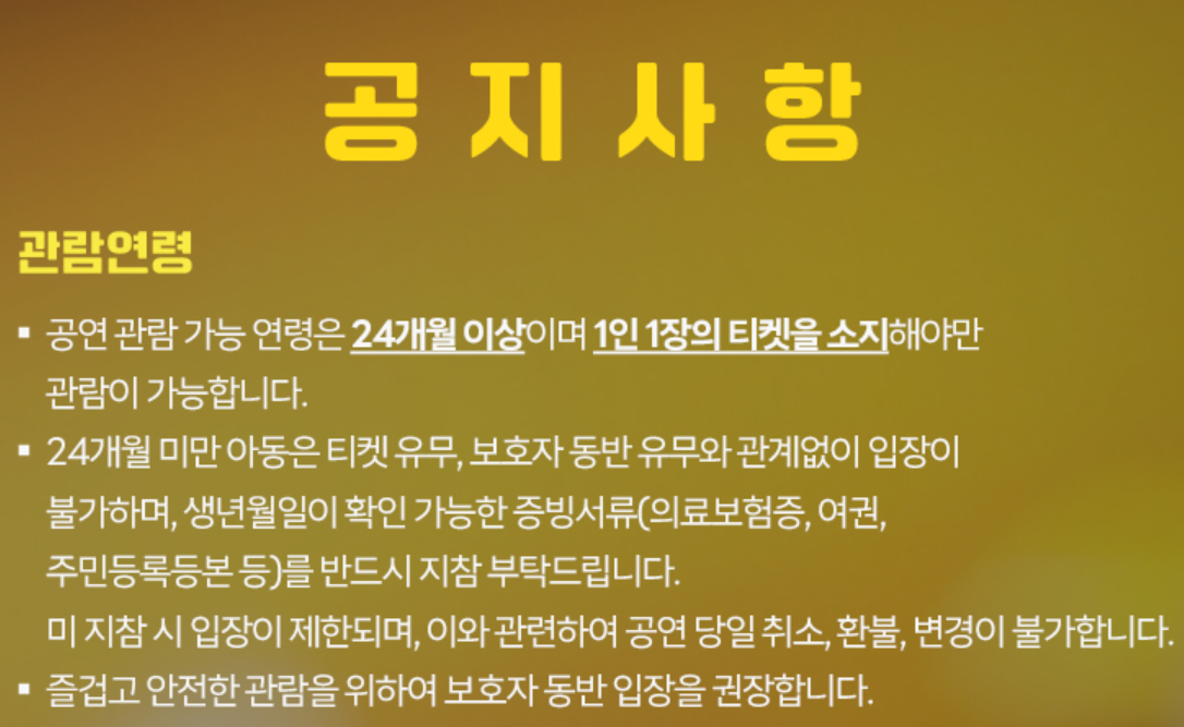 공연을 관람하려면 1인 1티켓 소지 원칙을 준수해야 합니다. 24개월 미만 아동은 입장이 제한되며, 생년월일 확인을 위한 증빙 서류가 필수입니다. 보호자 동반 입장이 권장되며, 미리 준비해 주세요.
