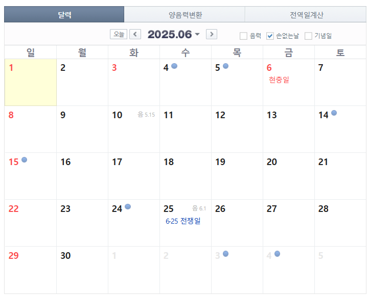 2025년 6월 이사·혼례 등 중요 일정 계획 시 참고할 수 있는 손없는날을 정리합니다. 음력 기준과 양력 변환 내용을 정확하게 안내해 드립니다.