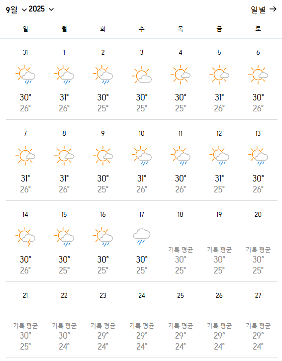 9월 초반은 대체로 맑은 날이 많아 해안 산책이나 야외 수영이 가능하다. 중순 이후 간헐적 소나기가 예상되며, 짧은 시간 내에 강우량이 높아질 수 있다. 우비나 휴대용 우산을 지참하면 돌발 비에도 대비할 수 있다. 일기예보 확인을 통해 일정 조정이 필요하다. 비 피해를 최소화하려면 주요 일정은 오전에 배치하는 것이 효과적이다.