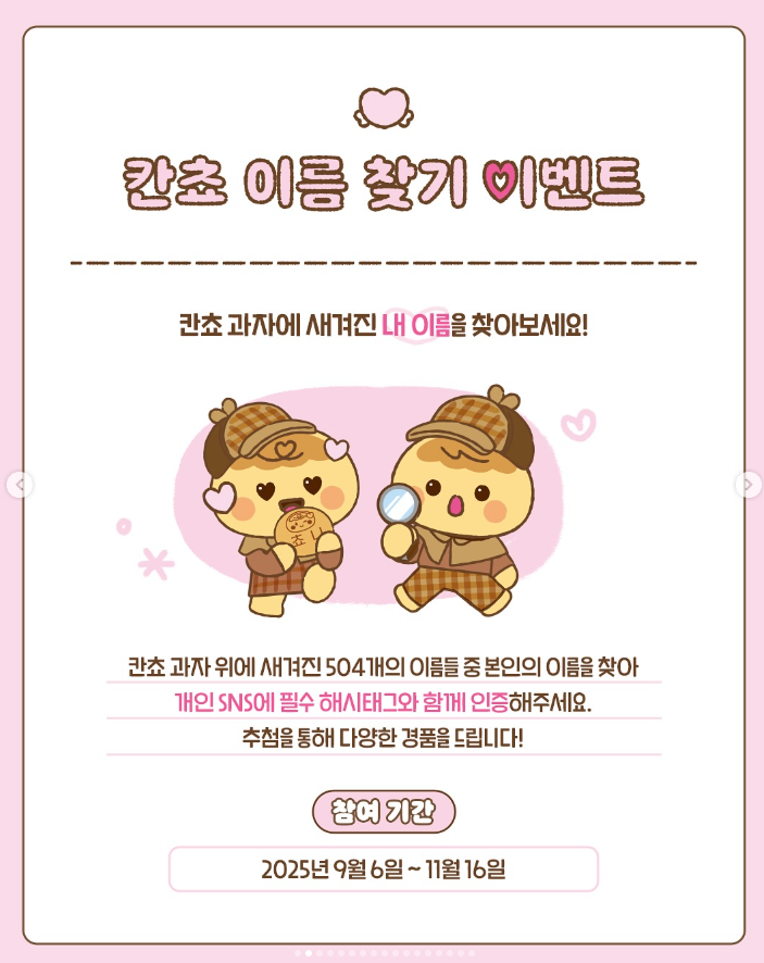 롯데 웰 푸드에서 준비한 이번 이벤트는 2025년 9월 6일부터 11월 16일까지 진행됩니다. 칸쵸 과자 위에 무려 504개의 이름이 새겨져 있으며, 그 중 본인의 이름을 찾아 SNS에 인증하는 방식입니다. name이 없어도 지인의 name을 태그하면 참여할 수 있어 폭넓은 참여가 가능합니다. 남녀노소 누구나 즐겁게 참여할 수 있는 점이 큰 매력입니다.