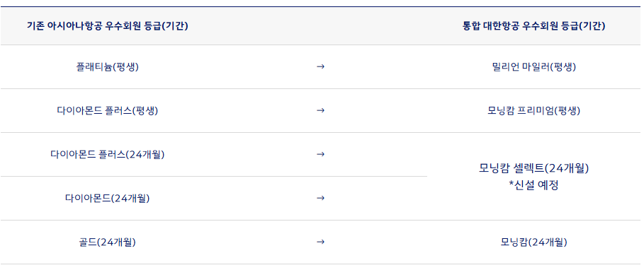 A. 아시아나항공의 기존 우수회원 등급은 대한항공의 유사 등급으로 자동 매칭됩니다. 예를 들어, 다이아몬드 플러스 회원은 모닝캄 셀렉트로, 플래티늄 회원은 밀리언 마일러 등으로 전환됩니다. 기존 등급 기간은 그대로 유지됩니다.