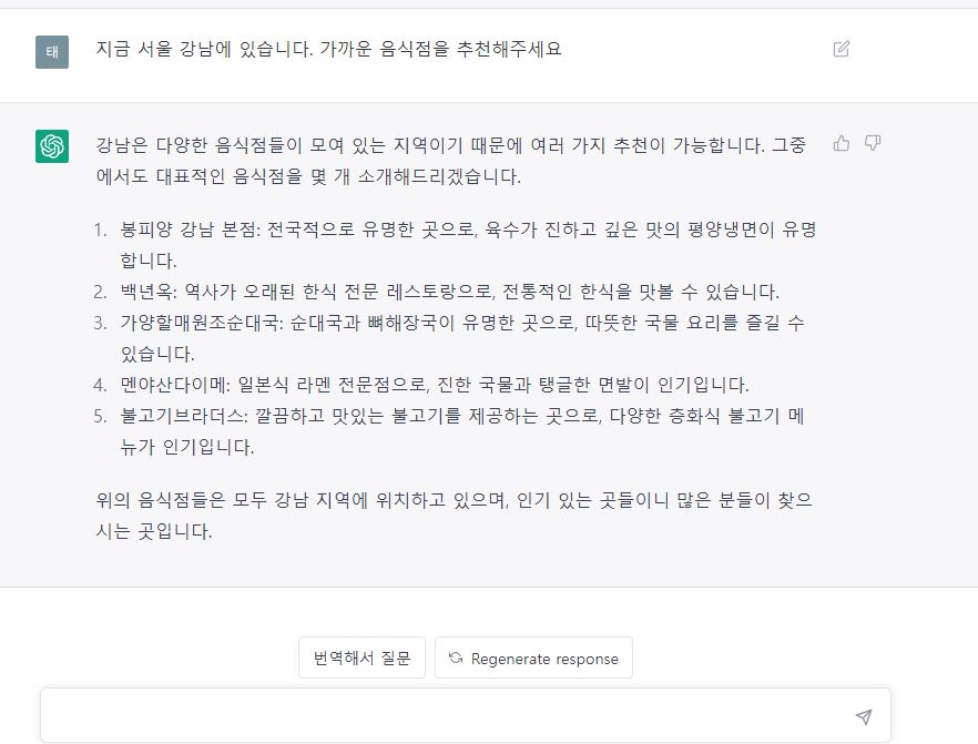 좀 더 학습을 시켜야한다는 생각이 들어서 구체적인 질문을 던져 보았습니다. 제가 있는 위치를 밝히고 음식점을 알려달라고 하니 무려 다섯군데나 추천을 해줍니다. 정말 깜짝 놀랐습니다.
