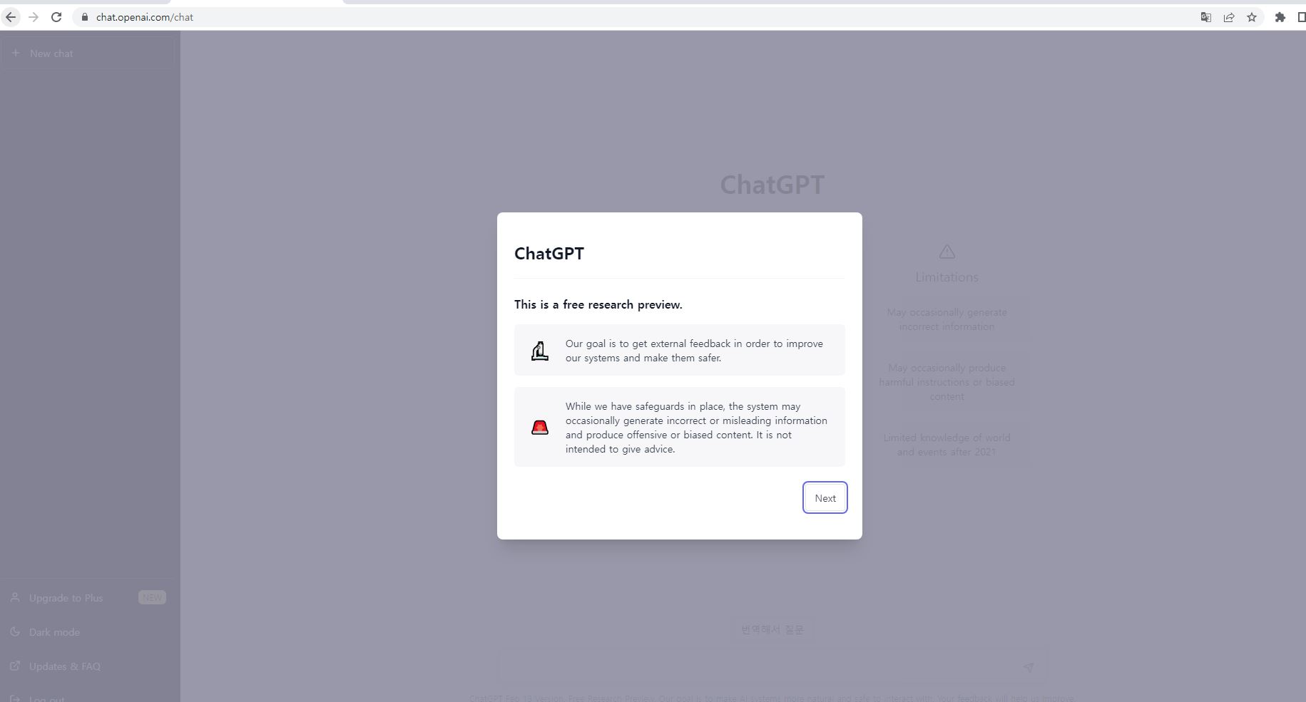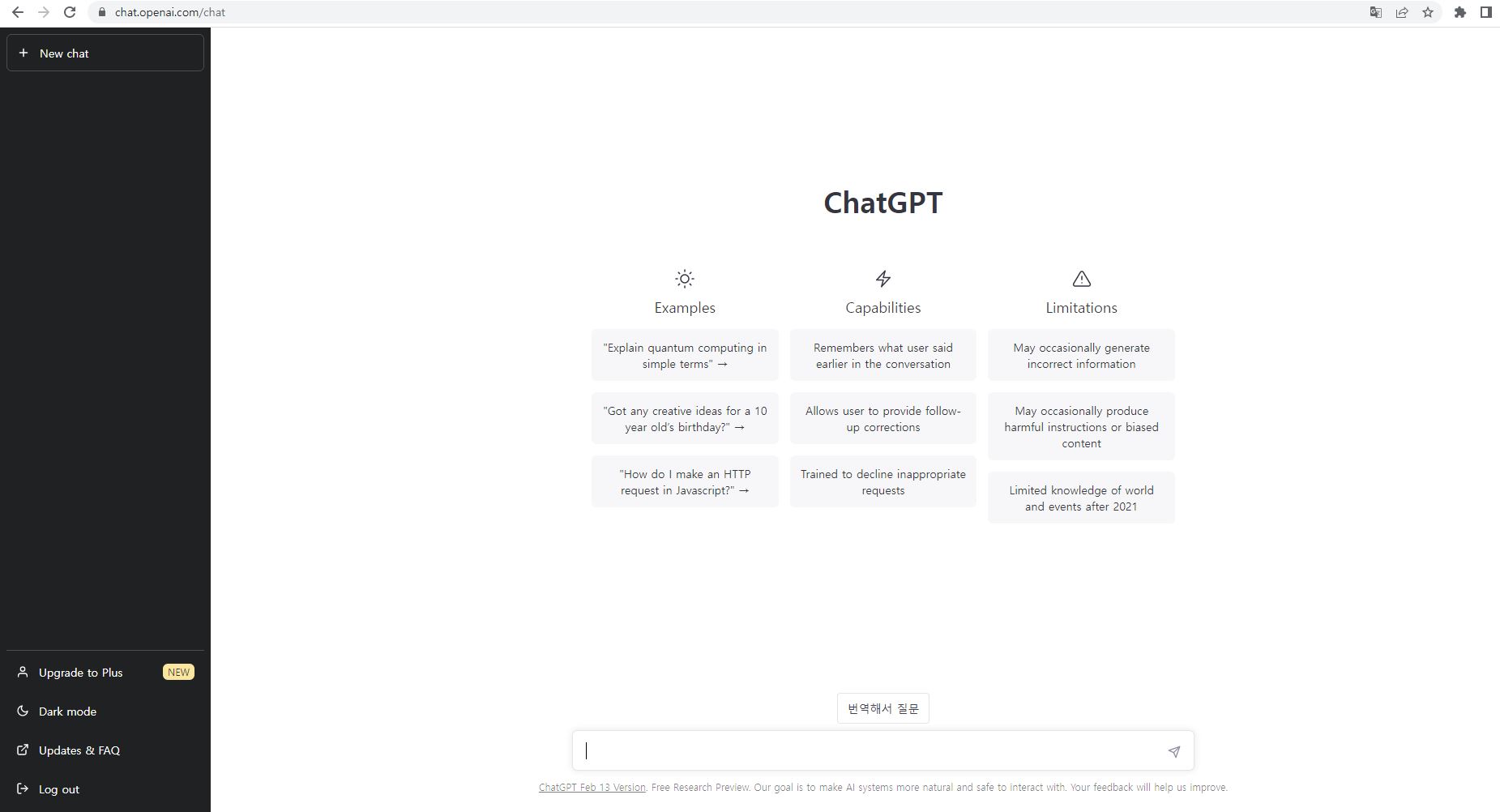 - chat.openai.com/ 에 들어갑니다. 아래와 같이 뜨네요. "Welcome to ChatGPT"