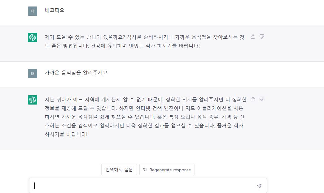 이 때 너무 배가 고파서 우선 배가 고프다고 해봤습니다. 아래 검색창처럼 생긴곳에 배고파요라고 썼습니다. 하지만 알아서 해결하라는 무책임하게 이야기를 해주네요.
