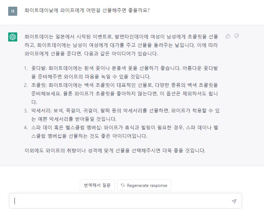내친김에 한가지 더 질문해 보았습니다. 이제 곧 화이트데이가 돌아오는데 어떤 선물을 하면 좋을지를 물어봤습니다.