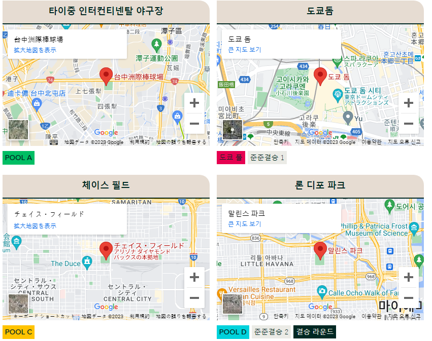 경기는 총 4군데에서 이루어 지는데 대만(타이중 인터컨티넬탈), 일본(도쿄돔), 미국(체이스 필드, 론 디포 파크) 4군데에서 이루어 집니다. 세계 대회라 불릴만 합니다.