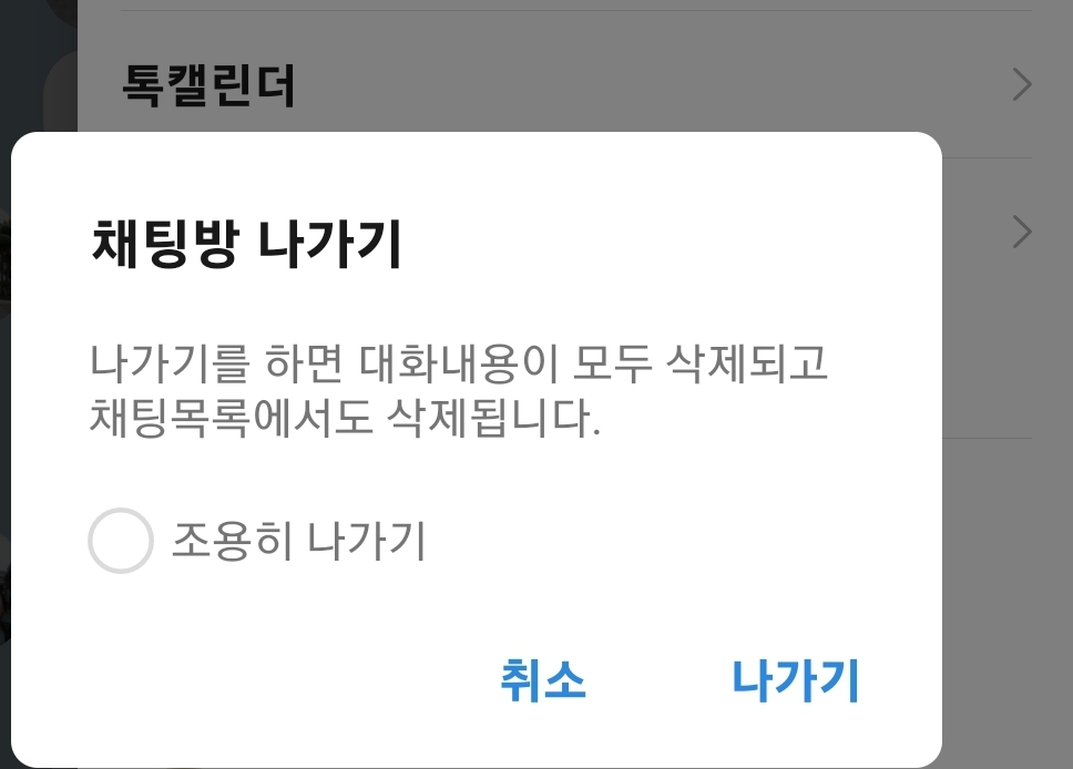 메뉴 버튼을 클릭하면 여러 옵션이 나타납니다. 여기서 '나가기' 옵션을 선택하고, 팝업 창에서 '조용히 나가기'를 활성화하세요. 이 단계를 마치면, 대화방을 나가면서 다른 참여자들에게 알리지 않습니다.